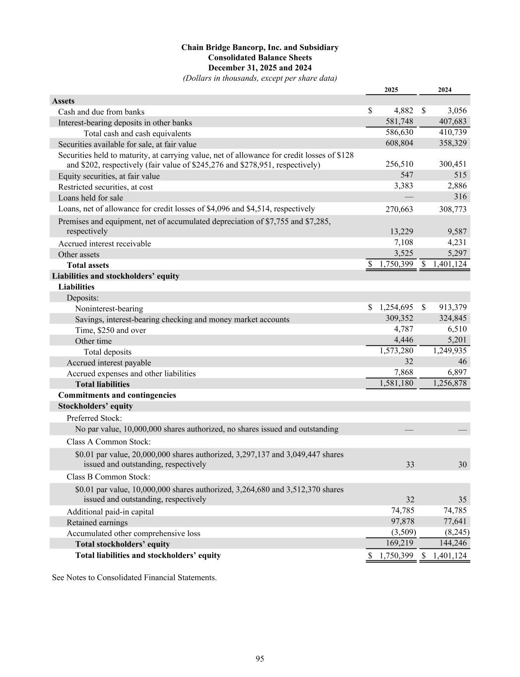 Chain Bridge Bancorp, Inc. and Subsidiary Consolidated Balance Sheets December 31, 2025 and 2024 (Dollars in thousands, except per share data) 2025 2024 Assets Cash and due from banks $ 4,882 $ 3,056 Interest-bearing deposits in other banks 581,748 407,683 Total cash and cash equivalents 586,630 410,739 Securities available for sale, at fair value 608,804 358,329 Securities held to maturity, at carrying value, net of allowance for credit losses of $128 and $202, respectively (fair value of $245,276 and $278,951, respectively) 256,510 300,451 Equity securities, at fair value 547 515 Restricted securities, at cost 3,383 2,886 Loans held for sale — 316 Loans, net of allowance for credit losses of $4,096 and $4,514, respectively 270,663 308,773 Premises and equipment, net of accumulated depreciation of $7,755 and $7,285, respectively 13,229 9,587 Accrued interest receivable 7,108 4,231 Other assets 3,525 5,297 Total assets $ 1,750,399 $ 1,401,124 Liabilities and stockholders’ equity Liabilities Deposits: Noninterest-bearing $ 1,254,695 $ 913,379 Savings, interest-bearing checking and money market accounts 309,352 324,845 Time, $250 and over 4,787 6,510 Other time 4,446 5,201 Total deposits 1,573,280 1,249,935 Accrued interest payable 32 46 Accrued expenses and other liabilities 7,868 6,897 Total liabilities 1,581,180 1,256,878 Commitments and contingencies Stockholders’ equity Preferred Stock: No par value, 10,000,000 shares authorized, no shares issued and outstanding — — Class A Common Stock: $0.01 par value, 20,000,000 shares authorized, 3,297,137 and 3,049,447 shares issued and outstanding, respectively 33 30 Class B Common Stock: $0.01 par value, 10,000,000 shares authorized, 3,264,680 and 3,512,370 shares issued and outstanding, respectively 32 35 Additional paid-in capital 74,785 74,785 Retained earnings 97,878 77,641 Accumulated other comprehensive loss (3,509) (8,245) Total stockholders’ equity 169,219 144,246 Total liabilities and stockholders’ equity $ 1,750,399 $ 1,401,124 See Notes to Consolidated Financial Statements. 95