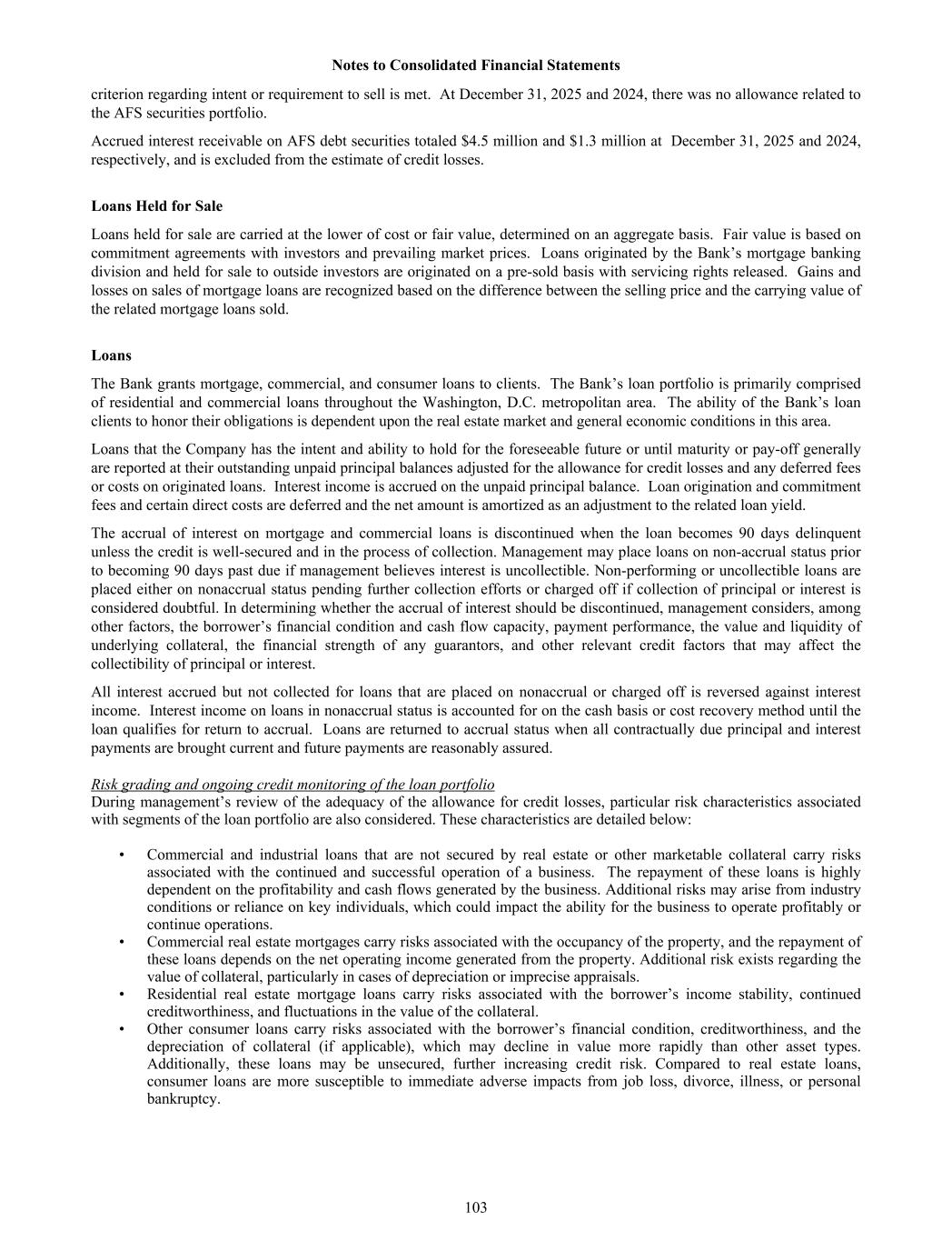 criterion regarding intent or requirement to sell is met. At December 31, 2025 and 2024, there was no allowance related to the AFS securities portfolio. Accrued interest receivable on AFS debt securities totaled $4.5 million and $1.3 million at December 31, 2025 and 2024, respectively, and is excluded from the estimate of credit losses. Loans Held for Sale Loans held for sale are carried at the lower of cost or fair value, determined on an aggregate basis. Fair value is based on commitment agreements with investors and prevailing market prices. Loans originated by the Bank’s mortgage banking division and held for sale to outside investors are originated on a pre-sold basis with servicing rights released. Gains and losses on sales of mortgage loans are recognized based on the difference between the selling price and the carrying value of the related mortgage loans sold. Loans The Bank grants mortgage, commercial, and consumer loans to clients. The Bank’s loan portfolio is primarily comprised of residential and commercial loans throughout the Washington, D.C. metropolitan area. The ability of the Bank’s loan clients to honor their obligations is dependent upon the real estate market and general economic conditions in this area. Loans that the Company has the intent and ability to hold for the foreseeable future or until maturity or pay-off generally are reported at their outstanding unpaid principal balances adjusted for the allowance for credit losses and any deferred fees or costs on originated loans. Interest income is accrued on the unpaid principal balance. Loan origination and commitment fees and certain direct costs are deferred and the net amount is amortized as an adjustment to the related loan yield. The accrual of interest on mortgage and commercial loans is discontinued when the loan becomes 90 days delinquent unless the credit is well-secured and in the process of collection. Management may place loans on non-accrual status prior to becoming 90 days past due if management believes interest is uncollectible. Non-performing or uncollectible loans are placed either on nonaccrual status pending further collection efforts or charged off if collection of principal or interest is considered doubtful. In determining whether the accrual of interest should be discontinued, management considers, among other factors, the borrower’s financial condition and cash flow capacity, payment performance, the value and liquidity of underlying collateral, the financial strength of any guarantors, and other relevant credit factors that may affect the collectibility of principal or interest. All interest accrued but not collected for loans that are placed on nonaccrual or charged off is reversed against interest income. Interest income on loans in nonaccrual status is accounted for on the cash basis or cost recovery method until the loan qualifies for return to accrual. Loans are returned to accrual status when all contractually due principal and interest payments are brought current and future payments are reasonably assured. Risk grading and ongoing credit monitoring of the loan portfolio During management’s review of the adequacy of the allowance for credit losses, particular risk characteristics associated with segments of the loan portfolio are also considered. These characteristics are detailed below: • Commercial and industrial loans that are not secured by real estate or other marketable collateral carry risks associated with the continued and successful operation of a business. The repayment of these loans is highly dependent on the profitability and cash flows generated by the business. Additional risks may arise from industry conditions or reliance on key individuals, which could impact the ability for the business to operate profitably or continue operations. • Commercial real estate mortgages carry risks associated with the occupancy of the property, and the repayment of these loans depends on the net operating income generated from the property. Additional risk exists regarding the value of collateral, particularly in cases of depreciation or imprecise appraisals. • Residential real estate mortgage loans carry risks associated with the borrower’s income stability, continued creditworthiness, and fluctuations in the value of the collateral. • Other consumer loans carry risks associated with the borrower’s financial condition, creditworthiness, and the depreciation of collateral (if applicable), which may decline in value more rapidly than other asset types. Additionally, these loans may be unsecured, further increasing credit risk. Compared to real estate loans, consumer loans are more susceptible to immediate adverse impacts from job loss, divorce, illness, or personal bankruptcy. Notes to Consolidated Financial Statements 103