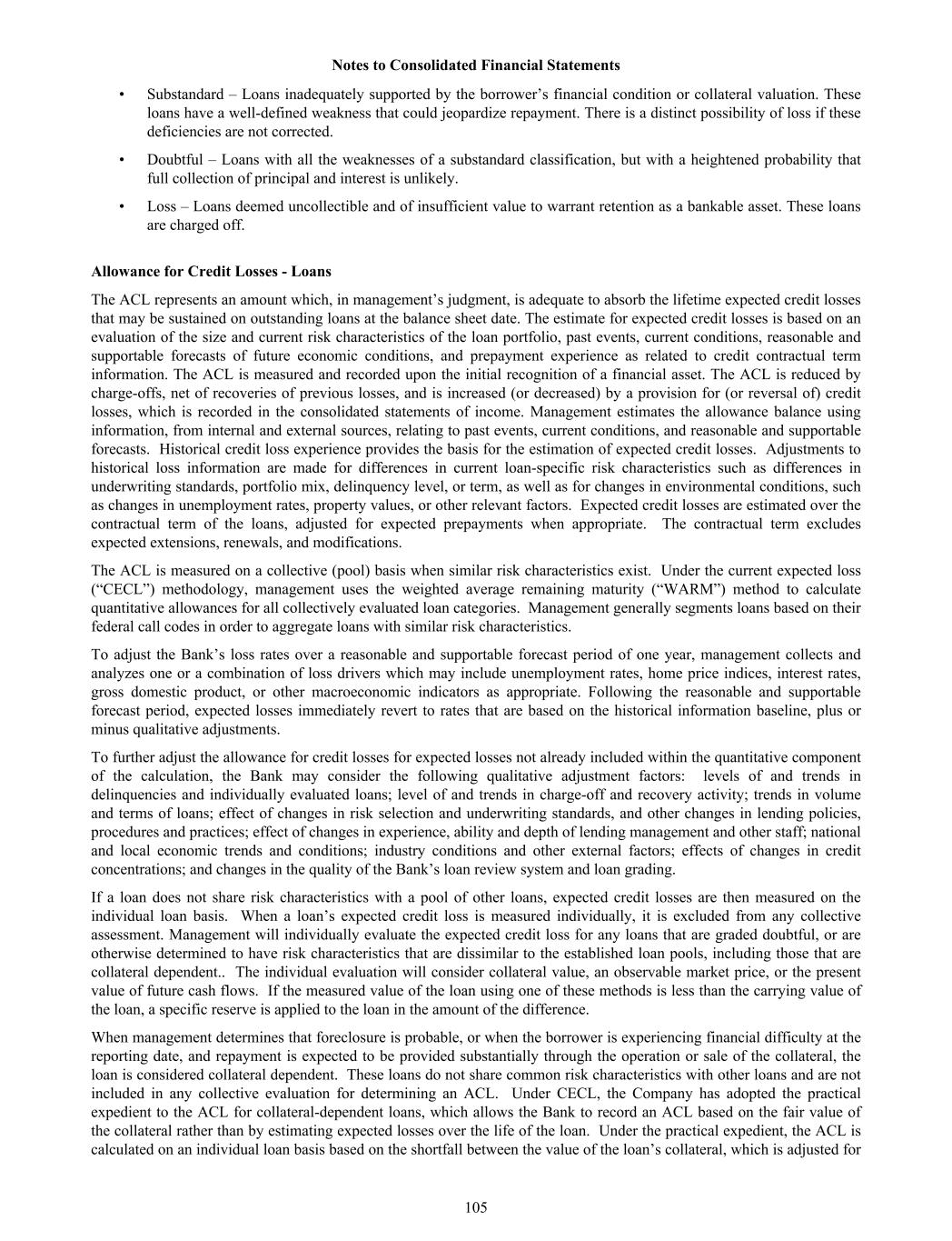 • Substandard – Loans inadequately supported by the borrower’s financial condition or collateral valuation. These loans have a well-defined weakness that could jeopardize repayment. There is a distinct possibility of loss if these deficiencies are not corrected. • Doubtful – Loans with all the weaknesses of a substandard classification, but with a heightened probability that full collection of principal and interest is unlikely. • Loss – Loans deemed uncollectible and of insufficient value to warrant retention as a bankable asset. These loans are charged off. Allowance for Credit Losses - Loans The ACL represents an amount which, in management’s judgment, is adequate to absorb the lifetime expected credit losses that may be sustained on outstanding loans at the balance sheet date. The estimate for expected credit losses is based on an evaluation of the size and current risk characteristics of the loan portfolio, past events, current conditions, reasonable and supportable forecasts of future economic conditions, and prepayment experience as related to credit contractual term information. The ACL is measured and recorded upon the initial recognition of a financial asset. The ACL is reduced by charge-offs, net of recoveries of previous losses, and is increased (or decreased) by a provision for (or reversal of) credit losses, which is recorded in the consolidated statements of income. Management estimates the allowance balance using information, from internal and external sources, relating to past events, current conditions, and reasonable and supportable forecasts. Historical credit loss experience provides the basis for the estimation of expected credit losses. Adjustments to historical loss information are made for differences in current loan-specific risk characteristics such as differences in underwriting standards, portfolio mix, delinquency level, or term, as well as for changes in environmental conditions, such as changes in unemployment rates, property values, or other relevant factors. Expected credit losses are estimated over the contractual term of the loans, adjusted for expected prepayments when appropriate. The contractual term excludes expected extensions, renewals, and modifications. The ACL is measured on a collective (pool) basis when similar risk characteristics exist. Under the current expected loss (“CECL”) methodology, management uses the weighted average remaining maturity (“WARM”) method to calculate quantitative allowances for all collectively evaluated loan categories. Management generally segments loans based on their federal call codes in order to aggregate loans with similar risk characteristics. To adjust the Bank’s loss rates over a reasonable and supportable forecast period of one year, management collects and analyzes one or a combination of loss drivers which may include unemployment rates, home price indices, interest rates, gross domestic product, or other macroeconomic indicators as appropriate. Following the reasonable and supportable forecast period, expected losses immediately revert to rates that are based on the historical information baseline, plus or minus qualitative adjustments. To further adjust the allowance for credit losses for expected losses not already included within the quantitative component of the calculation, the Bank may consider the following qualitative adjustment factors: levels of and trends in delinquencies and individually evaluated loans; level of and trends in charge-off and recovery activity; trends in volume and terms of loans; effect of changes in risk selection and underwriting standards, and other changes in lending policies, procedures and practices; effect of changes in experience, ability and depth of lending management and other staff; national and local economic trends and conditions; industry conditions and other external factors; effects of changes in credit concentrations; and changes in the quality of the Bank’s loan review system and loan grading. If a loan does not share risk characteristics with a pool of other loans, expected credit losses are then measured on the individual loan basis. When a loan’s expected credit loss is measured individually, it is excluded from any collective assessment. Management will individually evaluate the expected credit loss for any loans that are graded doubtful, or are otherwise determined to have risk characteristics that are dissimilar to the established loan pools, including those that are collateral dependent.. The individual evaluation will consider collateral value, an observable market price, or the present value of future cash flows. If the measured value of the loan using one of these methods is less than the carrying value of the loan, a specific reserve is applied to the loan in the amount of the difference. When management determines that foreclosure is probable, or when the borrower is experiencing financial difficulty at the reporting date, and repayment is expected to be provided substantially through the operation or sale of the collateral, the loan is considered collateral dependent. These loans do not share common risk characteristics with other loans and are not included in any collective evaluation for determining an ACL. Under CECL, the Company has adopted the practical expedient to the ACL for collateral-dependent loans, which allows the Bank to record an ACL based on the fair value of the collateral rather than by estimating expected losses over the life of the loan. Under the practical expedient, the ACL is calculated on an individual loan basis based on the shortfall between the value of the loan’s collateral, which is adjusted for Notes to Consolidated Financial Statements 105