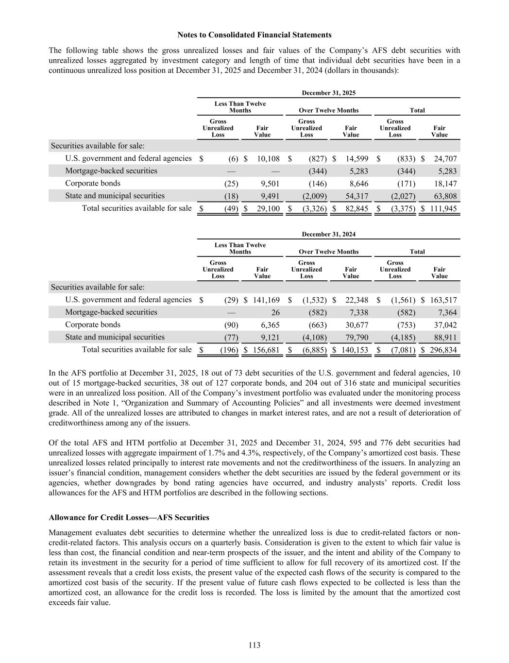 The following table shows the gross unrealized losses and fair values of the Company’s AFS debt securities with unrealized losses aggregated by investment category and length of time that individual debt securities have been in a continuous unrealized loss position at December 31, 2025 and December 31, 2024 (dollars in thousands): December 31, 2025 Less Than Twelve Months Over Twelve Months Total Gross Unrealized Loss Fair Value Gross Unrealized Loss Fair Value Gross Unrealized Loss Fair Value Securities available for sale: U.S. government and federal agencies $ (6) $ 10,108 $ (827) $ 14,599 $ (833) $ 24,707 Mortgage-backed securities — — (344) 5,283 (344) 5,283 Corporate bonds (25) 9,501 (146) 8,646 (171) 18,147 State and municipal securities (18) 9,491 (2,009) 54,317 (2,027) 63,808 Total securities available for sale $ (49) $ 29,100 $ (3,326) $ 82,845 $ (3,375) $ 111,945 December 31, 2024 Less Than Twelve Months Over Twelve Months Total Gross Unrealized Loss Fair Value Gross Unrealized Loss Fair Value Gross Unrealized Loss Fair Value Securities available for sale: U.S. government and federal agencies $ (29) $ 141,169 $ (1,532) $ 22,348 $ (1,561) $ 163,517 Mortgage-backed securities — 26 (582) 7,338 (582) 7,364 Corporate bonds (90) 6,365 (663) 30,677 (753) 37,042 State and municipal securities (77) 9,121 (4,108) 79,790 (4,185) 88,911 Total securities available for sale $ (196) $ 156,681 $ (6,885) $ 140,153 $ (7,081) $ 296,834 In the AFS portfolio at December 31, 2025, 18 out of 73 debt securities of the U.S. government and federal agencies, 10 out of 15 mortgage-backed securities, 38 out of 127 corporate bonds, and 204 out of 316 state and municipal securities were in an unrealized loss position. All of the Company’s investment portfolio was evaluated under the monitoring process described in Note 1, “Organization and Summary of Accounting Policies” and all investments were deemed investment grade. All of the unrealized losses are attributed to changes in market interest rates, and are not a result of deterioration of creditworthiness among any of the issuers. Of the total AFS and HTM portfolio at December 31, 2025 and December 31, 2024, 595 and 776 debt securities had unrealized losses with aggregate impairment of 1.7% and 4.3%, respectively, of the Company’s amortized cost basis. These unrealized losses related principally to interest rate movements and not the creditworthiness of the issuers. In analyzing an issuer’s financial condition, management considers whether the debt securities are issued by the federal government or its agencies, whether downgrades by bond rating agencies have occurred, and industry analysts’ reports. Credit loss allowances for the AFS and HTM portfolios are described in the following sections. Allowance for Credit Losses—AFS Securities Management evaluates debt securities to determine whether the unrealized loss is due to credit-related factors or non- credit-related factors. This analysis occurs on a quarterly basis. Consideration is given to the extent to which fair value is less than cost, the financial condition and near-term prospects of the issuer, and the intent and ability of the Company to retain its investment in the security for a period of time sufficient to allow for full recovery of its amortized cost. If the assessment reveals that a credit loss exists, the present value of the expected cash flows of the security is compared to the amortized cost basis of the security. If the present value of future cash flows expected to be collected is less than the amortized cost, an allowance for the credit loss is recorded. The loss is limited by the amount that the amortized cost exceeds fair value. Notes to Consolidated Financial Statements 113