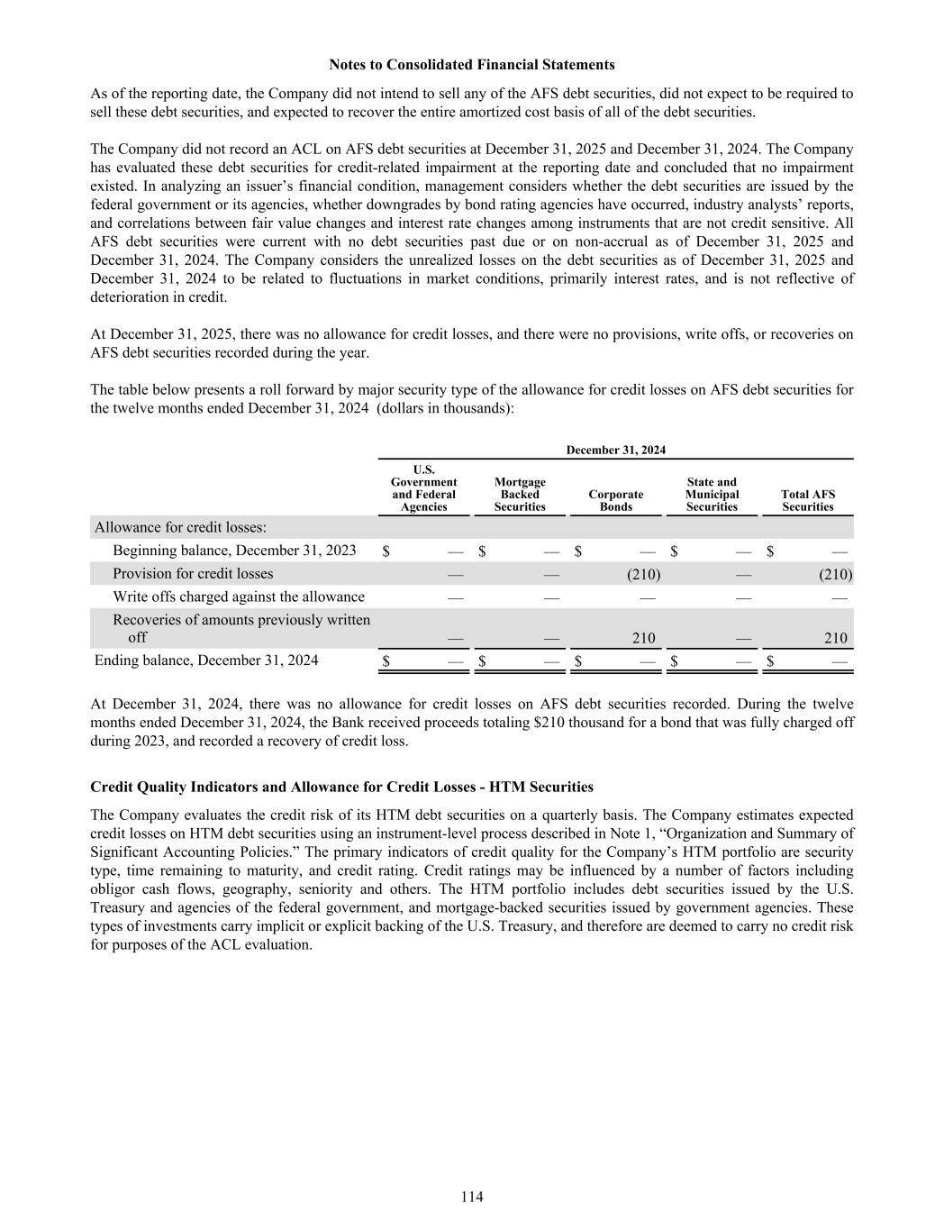 As of the reporting date, the Company did not intend to sell any of the AFS debt securities, did not expect to be required to sell these debt securities, and expected to recover the entire amortized cost basis of all of the debt securities. The Company did not record an ACL on AFS debt securities at December 31, 2025 and December 31, 2024. The Company has evaluated these debt securities for credit-related impairment at the reporting date and concluded that no impairment existed. In analyzing an issuer’s financial condition, management considers whether the debt securities are issued by the federal government or its agencies, whether downgrades by bond rating agencies have occurred, industry analysts’ reports, and correlations between fair value changes and interest rate changes among instruments that are not credit sensitive. All AFS debt securities were current with no debt securities past due or on non-accrual as of December 31, 2025 and December 31, 2024. The Company considers the unrealized losses on the debt securities as of December 31, 2025 and December 31, 2024 to be related to fluctuations in market conditions, primarily interest rates, and is not reflective of deterioration in credit. At December 31, 2025, there was no allowance for credit losses, and there were no provisions, write offs, or recoveries on AFS debt securities recorded during the year. The table below presents a roll forward by major security type of the allowance for credit losses on AFS debt securities for the twelve months ended December 31, 2024 (dollars in thousands): December 31, 2024 U.S. Government and Federal Agencies Mortgage Backed Securities Corporate Bonds State and Municipal Securities Total AFS Securities Allowance for credit losses: Beginning balance, December 31, 2023 $ — $ — $ — $ — $ — Provision for credit losses — — (210) — (210) Write offs charged against the allowance — — — — — Recoveries of amounts previously written off — — 210 — 210 Ending balance, December 31, 2024 $ — $ — $ — $ — $ — At December 31, 2024, there was no allowance for credit losses on AFS debt securities recorded. During the twelve months ended December 31, 2024, the Bank received proceeds totaling $210 thousand for a bond that was fully charged off during 2023, and recorded a recovery of credit loss. Credit Quality Indicators and Allowance for Credit Losses - HTM Securities The Company evaluates the credit risk of its HTM debt securities on a quarterly basis. The Company estimates expected credit losses on HTM debt securities using an instrument-level process described in Note 1, “Organization and Summary of Significant Accounting Policies.” The primary indicators of credit quality for the Company’s HTM portfolio are security type, time remaining to maturity, and credit rating. Credit ratings may be influenced by a number of factors including obligor cash flows, geography, seniority and others. The HTM portfolio includes debt securities issued by the U.S. Treasury and agencies of the federal government, and mortgage-backed securities issued by government agencies. These types of investments carry implicit or explicit backing of the U.S. Treasury, and therefore are deemed to carry no credit risk for purposes of the ACL evaluation. Notes to Consolidated Financial Statements 114