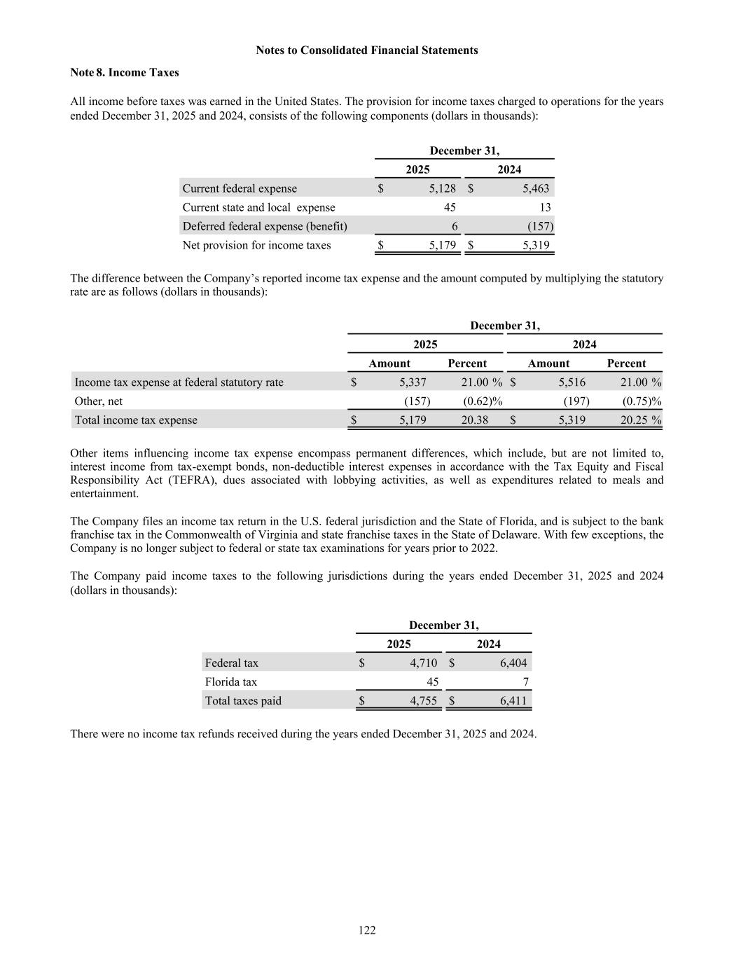 Note 8. Income Taxes All income before taxes was earned in the United States. The provision for income taxes charged to operations for the years ended December 31, 2025 and 2024, consists of the following components (dollars in thousands): December 31, 2025 2024 Current federal expense $ 5,128 $ 5,463 Current state and local expense 45 13 Deferred federal expense (benefit) 6 (157) Net provision for income taxes $ 5,179 $ 5,319 The difference between the Company’s reported income tax expense and the amount computed by multiplying the statutory rate are as follows (dollars in thousands): December 31, 2025 2024 Amount Percent Amount Percent Income tax expense at federal statutory rate $ 5,337 21.00 % $ 5,516 21.00 % Other, net (157) (0.62) % (197) (0.75) % Total income tax expense $ 5,179 20.38 $ 5,319 20.25 % Other items influencing income tax expense encompass permanent differences, which include, but are not limited to, interest income from tax-exempt bonds, non-deductible interest expenses in accordance with the Tax Equity and Fiscal Responsibility Act (TEFRA), dues associated with lobbying activities, as well as expenditures related to meals and entertainment. The Company files an income tax return in the U.S. federal jurisdiction and the State of Florida, and is subject to the bank franchise tax in the Commonwealth of Virginia and state franchise taxes in the State of Delaware. With few exceptions, the Company is no longer subject to federal or state tax examinations for years prior to 2022. The Company paid income taxes to the following jurisdictions during the years ended December 31, 2025 and 2024 (dollars in thousands): December 31, 2025 2024 Federal tax $ 4,710 $ 6,404 Florida tax 45 7 Total taxes paid $ 4,755 $ 6,411 There were no income tax refunds received during the years ended December 31, 2025 and 2024. Notes to Consolidated Financial Statements 122