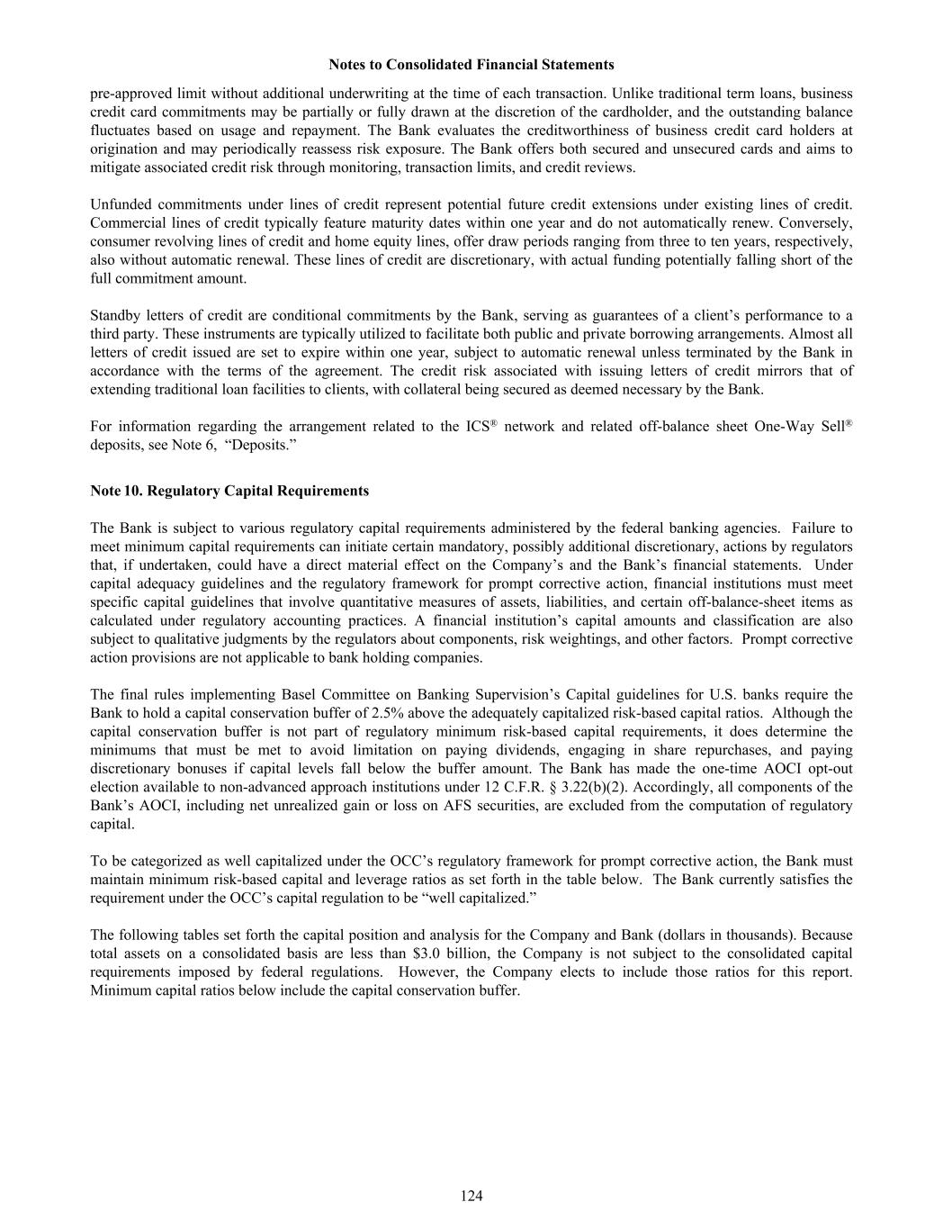 pre-approved limit without additional underwriting at the time of each transaction. Unlike traditional term loans, business credit card commitments may be partially or fully drawn at the discretion of the cardholder, and the outstanding balance fluctuates based on usage and repayment. The Bank evaluates the creditworthiness of business credit card holders at origination and may periodically reassess risk exposure. The Bank offers both secured and unsecured cards and aims to mitigate associated credit risk through monitoring, transaction limits, and credit reviews. Unfunded commitments under lines of credit represent potential future credit extensions under existing lines of credit. Commercial lines of credit typically feature maturity dates within one year and do not automatically renew. Conversely, consumer revolving lines of credit and home equity lines, offer draw periods ranging from three to ten years, respectively, also without automatic renewal. These lines of credit are discretionary, with actual funding potentially falling short of the full commitment amount. Standby letters of credit are conditional commitments by the Bank, serving as guarantees of a client’s performance to a third party. These instruments are typically utilized to facilitate both public and private borrowing arrangements. Almost all letters of credit issued are set to expire within one year, subject to automatic renewal unless terminated by the Bank in accordance with the terms of the agreement. The credit risk associated with issuing letters of credit mirrors that of extending traditional loan facilities to clients, with collateral being secured as deemed necessary by the Bank. For information regarding the arrangement related to the ICS® network and related off-balance sheet One-Way Sell® deposits, see Note 6, “Deposits.” Note 10. Regulatory Capital Requirements The Bank is subject to various regulatory capital requirements administered by the federal banking agencies. Failure to meet minimum capital requirements can initiate certain mandatory, possibly additional discretionary, actions by regulators that, if undertaken, could have a direct material effect on the Company’s and the Bank’s financial statements. Under capital adequacy guidelines and the regulatory framework for prompt corrective action, financial institutions must meet specific capital guidelines that involve quantitative measures of assets, liabilities, and certain off-balance-sheet items as calculated under regulatory accounting practices. A financial institution’s capital amounts and classification are also subject to qualitative judgments by the regulators about components, risk weightings, and other factors. Prompt corrective action provisions are not applicable to bank holding companies. The final rules implementing Basel Committee on Banking Supervision’s Capital guidelines for U.S. banks require the Bank to hold a capital conservation buffer of 2.5% above the adequately capitalized risk-based capital ratios. Although the capital conservation buffer is not part of regulatory minimum risk-based capital requirements, it does determine the minimums that must be met to avoid limitation on paying dividends, engaging in share repurchases, and paying discretionary bonuses if capital levels fall below the buffer amount. The Bank has made the one-time AOCI opt-out election available to non-advanced approach institutions under 12 C.F.R. § 3.22(b)(2). Accordingly, all components of the Bank’s AOCI, including net unrealized gain or loss on AFS securities, are excluded from the computation of regulatory capital. To be categorized as well capitalized under the OCC’s regulatory framework for prompt corrective action, the Bank must maintain minimum risk-based capital and leverage ratios as set forth in the table below. The Bank currently satisfies the requirement under the OCC’s capital regulation to be “well capitalized.” The following tables set forth the capital position and analysis for the Company and Bank (dollars in thousands). Because total assets on a consolidated basis are less than $3.0 billion, the Company is not subject to the consolidated capital requirements imposed by federal regulations. However, the Company elects to include those ratios for this report. Minimum capital ratios below include the capital conservation buffer. Notes to Consolidated Financial Statements 124