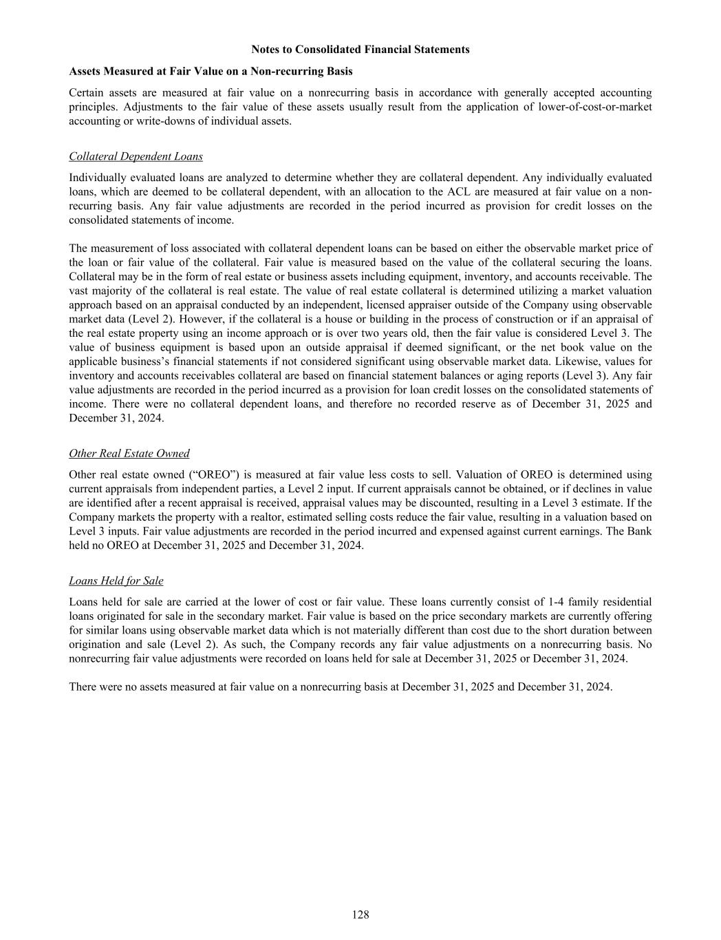 Assets Measured at Fair Value on a Non-recurring Basis Certain assets are measured at fair value on a nonrecurring basis in accordance with generally accepted accounting principles. Adjustments to the fair value of these assets usually result from the application of lower-of-cost-or-market accounting or write-downs of individual assets. Collateral Dependent Loans Individually evaluated loans are analyzed to determine whether they are collateral dependent. Any individually evaluated loans, which are deemed to be collateral dependent, with an allocation to the ACL are measured at fair value on a non- recurring basis. Any fair value adjustments are recorded in the period incurred as provision for credit losses on the consolidated statements of income. The measurement of loss associated with collateral dependent loans can be based on either the observable market price of the loan or fair value of the collateral. Fair value is measured based on the value of the collateral securing the loans. Collateral may be in the form of real estate or business assets including equipment, inventory, and accounts receivable. The vast majority of the collateral is real estate. The value of real estate collateral is determined utilizing a market valuation approach based on an appraisal conducted by an independent, licensed appraiser outside of the Company using observable market data (Level 2). However, if the collateral is a house or building in the process of construction or if an appraisal of the real estate property using an income approach or is over two years old, then the fair value is considered Level 3. The value of business equipment is based upon an outside appraisal if deemed significant, or the net book value on the applicable business’s financial statements if not considered significant using observable market data. Likewise, values for inventory and accounts receivables collateral are based on financial statement balances or aging reports (Level 3). Any fair value adjustments are recorded in the period incurred as a provision for loan credit losses on the consolidated statements of income. There were no collateral dependent loans, and therefore no recorded reserve as of December 31, 2025 and December 31, 2024. Other Real Estate Owned Other real estate owned (“OREO”) is measured at fair value less costs to sell. Valuation of OREO is determined using current appraisals from independent parties, a Level 2 input. If current appraisals cannot be obtained, or if declines in value are identified after a recent appraisal is received, appraisal values may be discounted, resulting in a Level 3 estimate. If the Company markets the property with a realtor, estimated selling costs reduce the fair value, resulting in a valuation based on Level 3 inputs. Fair value adjustments are recorded in the period incurred and expensed against current earnings. The Bank held no OREO at December 31, 2025 and December 31, 2024. Loans Held for Sale Loans held for sale are carried at the lower of cost or fair value. These loans currently consist of 1-4 family residential loans originated for sale in the secondary market. Fair value is based on the price secondary markets are currently offering for similar loans using observable market data which is not materially different than cost due to the short duration between origination and sale (Level 2). As such, the Company records any fair value adjustments on a nonrecurring basis. No nonrecurring fair value adjustments were recorded on loans held for sale at December 31, 2025 or December 31, 2024. There were no assets measured at fair value on a nonrecurring basis at December 31, 2025 and December 31, 2024. Notes to Consolidated Financial Statements 128
