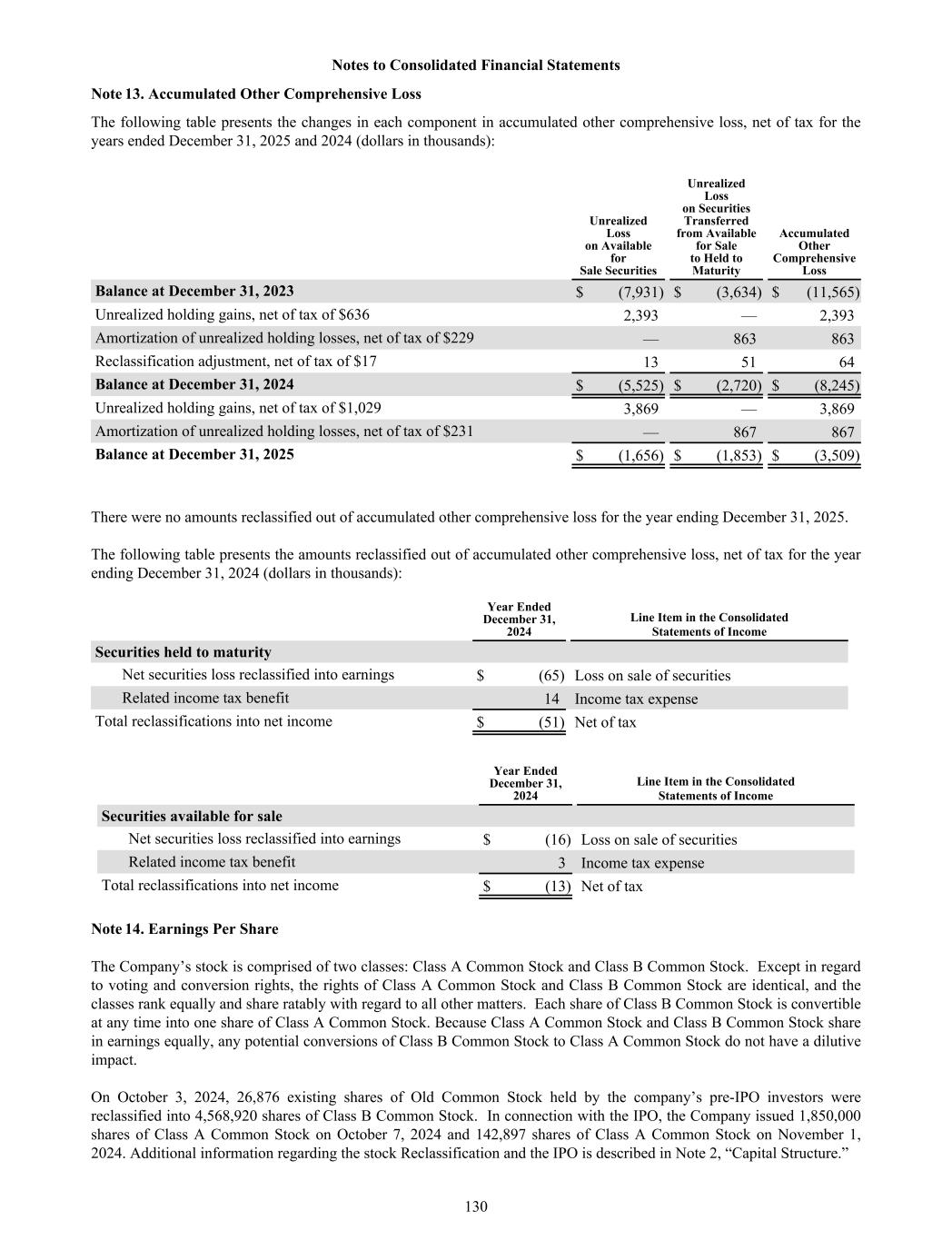 Note 13. Accumulated Other Comprehensive Loss The following table presents the changes in each component in accumulated other comprehensive loss, net of tax for the years ended December 31, 2025 and 2024 (dollars in thousands): Unrealized Loss on Available for Sale Securities Unrealized Loss on Securities Transferred from Available for Sale to Held to Maturity Accumulated Other Comprehensive Loss Balance at December 31, 2023 $ (7,931) $ (3,634) $ (11,565) Unrealized holding gains, net of tax of $636 2,393 — 2,393 Amortization of unrealized holding losses, net of tax of $229 — 863 863 Reclassification adjustment, net of tax of $17 13 51 64 Balance at December 31, 2024 $ (5,525) $ (2,720) $ (8,245) Unrealized holding gains, net of tax of $1,029 3,869 — 3,869 Amortization of unrealized holding losses, net of tax of $231 — 867 867 Balance at December 31, 2025 $ (1,656) $ (1,853) $ (3,509) There were no amounts reclassified out of accumulated other comprehensive loss for the year ending December 31, 2025. The following table presents the amounts reclassified out of accumulated other comprehensive loss, net of tax for the year ending December 31, 2024 (dollars in thousands): Year Ended December 31, 2024 Line Item in the Consolidated Statements of Income Securities held to maturity Net securities loss reclassified into earnings $ (65) Loss on sale of securities Related income tax benefit 14 Income tax expense Total reclassifications into net income $ (51) Net of tax Year Ended December 31, 2024 Line Item in the Consolidated Statements of Income Securities available for sale Net securities loss reclassified into earnings $ (16) Loss on sale of securities Related income tax benefit 3 Income tax expense Total reclassifications into net income $ (13) Net of tax Note 14. Earnings Per Share The Company’s stock is comprised of two classes: Class A Common Stock and Class B Common Stock. Except in regard to voting and conversion rights, the rights of Class A Common Stock and Class B Common Stock are identical, and the classes rank equally and share ratably with regard to all other matters. Each share of Class B Common Stock is convertible at any time into one share of Class A Common Stock. Because Class A Common Stock and Class B Common Stock share in earnings equally, any potential conversions of Class B Common Stock to Class A Common Stock do not have a dilutive impact. On October 3, 2024, 26,876 existing shares of Old Common Stock held by the company’s pre-IPO investors were reclassified into 4,568,920 shares of Class B Common Stock. In connection with the IPO, the Company issued 1,850,000 shares of Class A Common Stock on October 7, 2024 and 142,897 shares of Class A Common Stock on November 1, 2024. Additional information regarding the stock Reclassification and the IPO is described in Note 2, “Capital Structure.” Notes to Consolidated Financial Statements 130