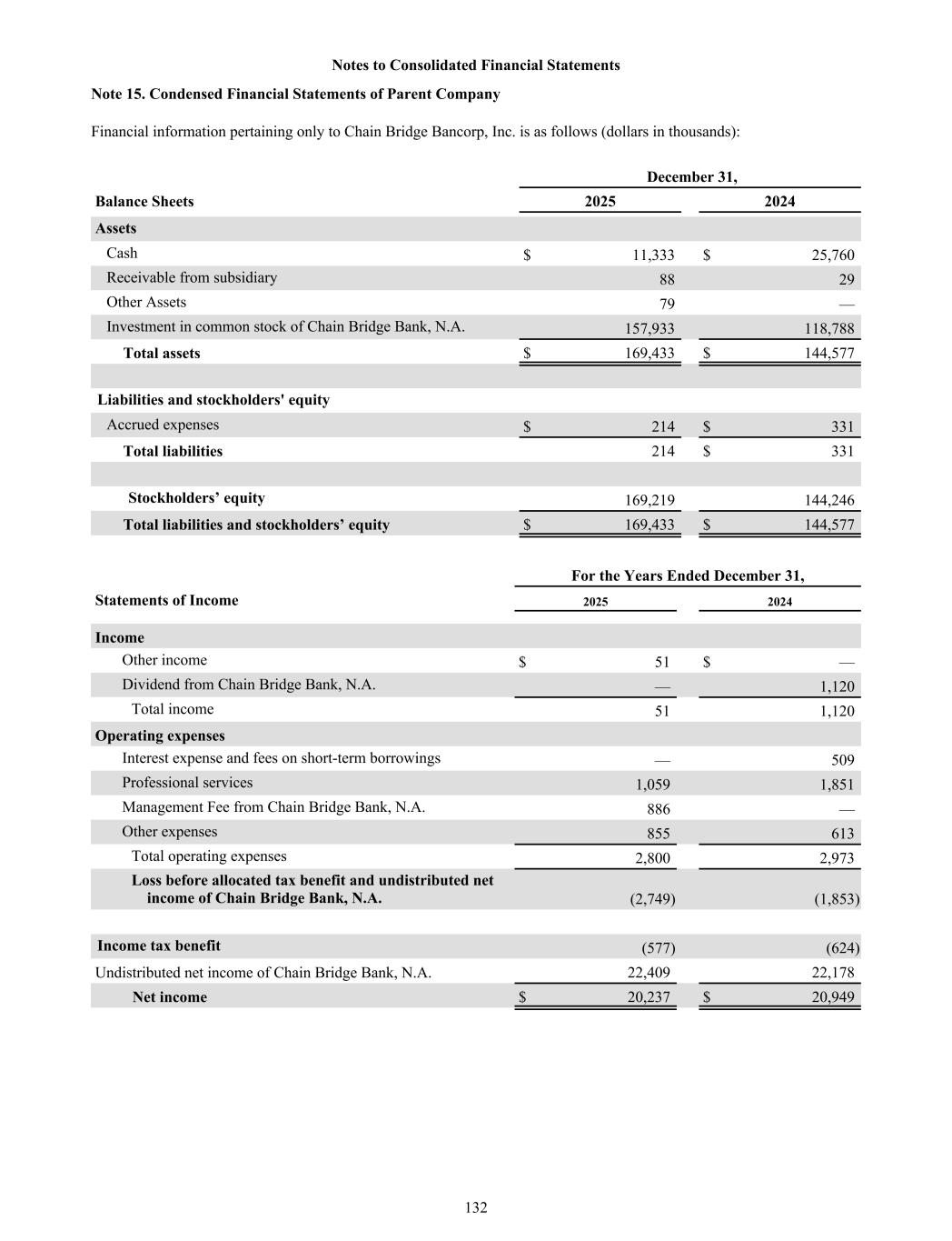 Note 15. Condensed Financial Statements of Parent Company Financial information pertaining only to Chain Bridge Bancorp, Inc. is as follows (dollars in thousands): December 31, Balance Sheets 2025 2024 Assets Cash $ 11,333 $ 25,760 Receivable from subsidiary 88 29 Other Assets 79 — Investment in common stock of Chain Bridge Bank, N.A. 157,933 118,788 Total assets $ 169,433 $ 144,577 Liabilities and stockholders' equity Accrued expenses $ 214 $ 331 Total liabilities 214 $ 331 Stockholders’ equity 169,219 144,246 Total liabilities and stockholders’ equity $ 169,433 $ 144,577 For the Years Ended December 31, Statements of Income 2025 2024 Income Other income $ 51 $ — Dividend from Chain Bridge Bank, N.A. — 1,120 Total income 51 1,120 Operating expenses Interest expense and fees on short-term borrowings — 509 Professional services 1,059 1,851 Management Fee from Chain Bridge Bank, N.A. 886 — Other expenses 855 613 Total operating expenses 2,800 2,973 Loss before allocated tax benefit and undistributed net income of Chain Bridge Bank, N.A. (2,749) (1,853) Income tax benefit (577) (624) Undistributed net income of Chain Bridge Bank, N.A. 22,409 22,178 Net income $ 20,237 $ 20,949 Notes to Consolidated Financial Statements 132