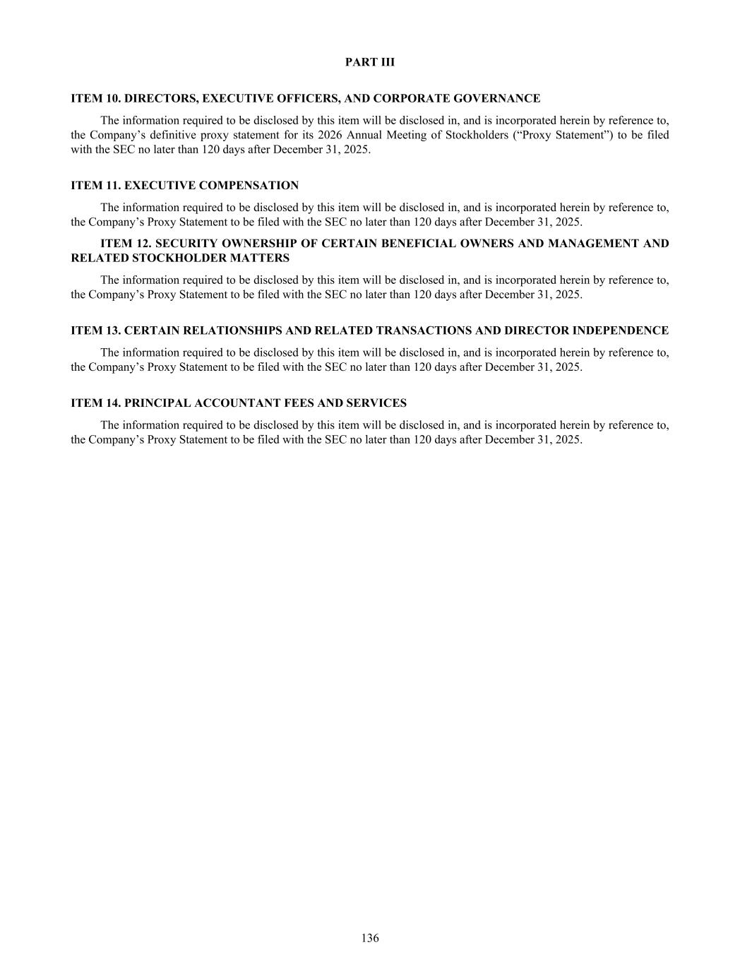 PART III ITEM 10. DIRECTORS, EXECUTIVE OFFICERS, AND CORPORATE GOVERNANCE The information required to be disclosed by this item will be disclosed in, and is incorporated herein by reference to, the Company’s definitive proxy statement for its 2026 Annual Meeting of Stockholders (“Proxy Statement”) to be filed with the SEC no later than 120 days after December 31, 2025. ITEM 11. EXECUTIVE COMPENSATION The information required to be disclosed by this item will be disclosed in, and is incorporated herein by reference to, the Company’s Proxy Statement to be filed with the SEC no later than 120 days after December 31, 2025. ITEM 12. SECURITY OWNERSHIP OF CERTAIN BENEFICIAL OWNERS AND MANAGEMENT AND RELATED STOCKHOLDER MATTERS The information required to be disclosed by this item will be disclosed in, and is incorporated herein by reference to, the Company’s Proxy Statement to be filed with the SEC no later than 120 days after December 31, 2025. ITEM 13. CERTAIN RELATIONSHIPS AND RELATED TRANSACTIONS AND DIRECTOR INDEPENDENCE The information required to be disclosed by this item will be disclosed in, and is incorporated herein by reference to, the Company’s Proxy Statement to be filed with the SEC no later than 120 days after December 31, 2025. ITEM 14. PRINCIPAL ACCOUNTANT FEES AND SERVICES The information required to be disclosed by this item will be disclosed in, and is incorporated herein by reference to, the Company’s Proxy Statement to be filed with the SEC no later than 120 days after December 31, 2025. 136
